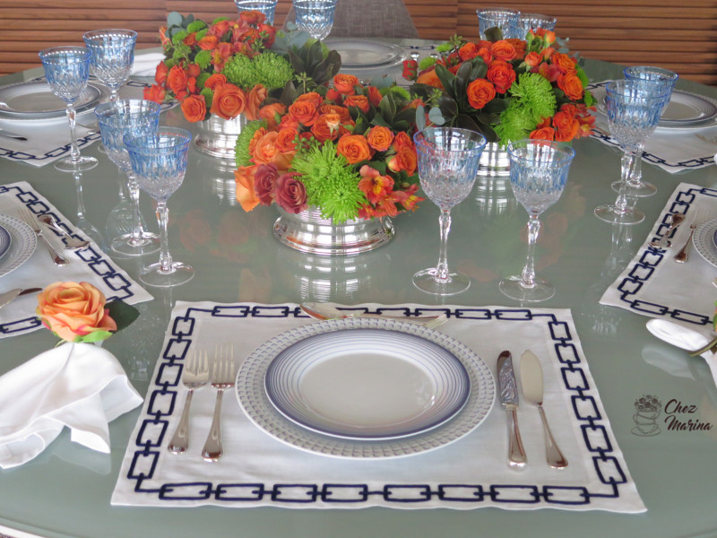 Escolhi o azul escuro dos jogos americanos/pratos e o azul claro das taças de cristal.