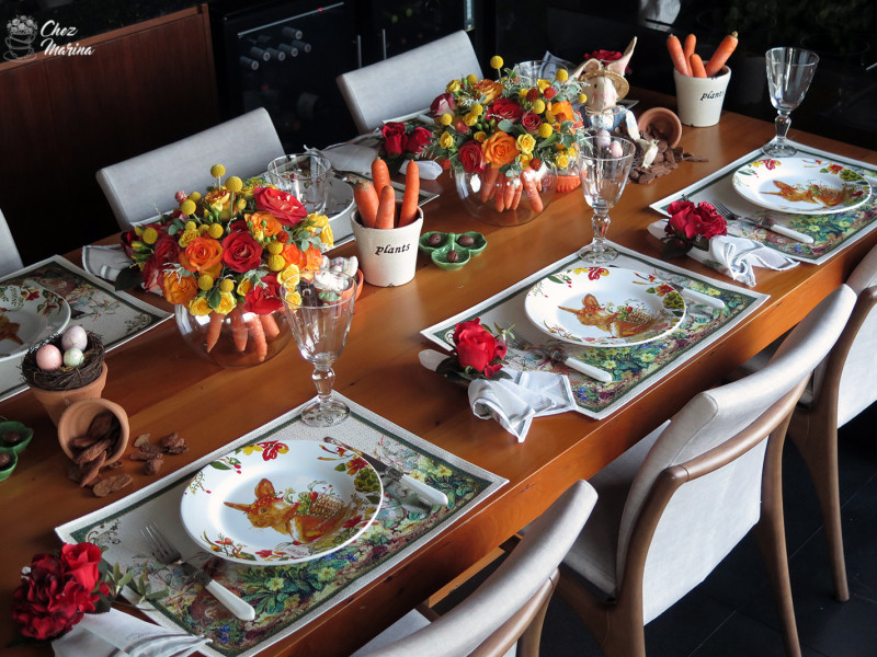 Para compor com esses arranjos eu escolhi os pratos temáticos de cerâmica Luiz Salvador nos tons dos arranjos, amarelo, laranja e verde e os jogos americanos também com o tema da Páscoa da Rebecca Duarte.