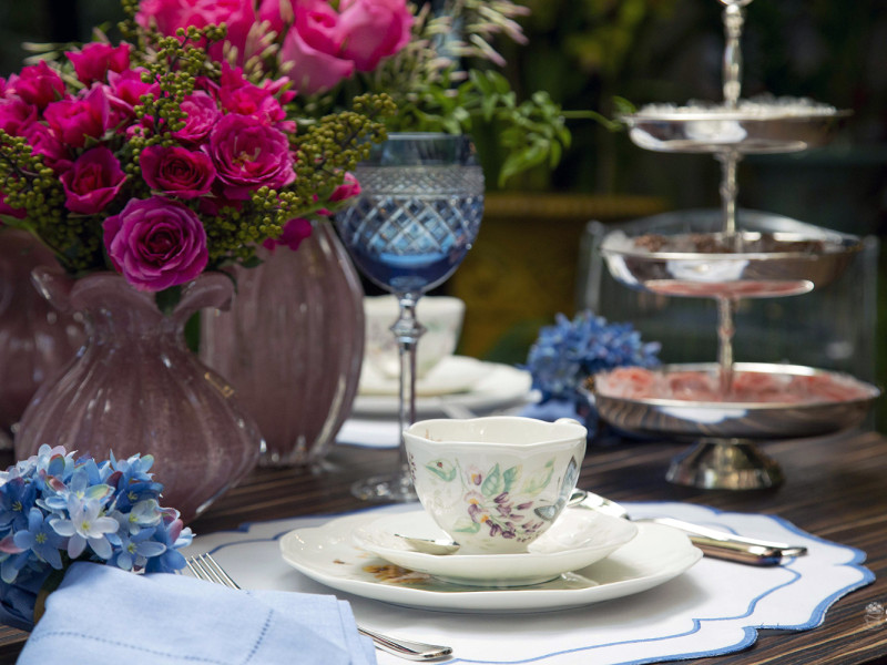Na composição, jogos americanos de algodão com bordado duplo azul, taças de cristal lapidadas também na cor azul, um dos jogos que eu mais amo da marca americana Lenox Butterfly.