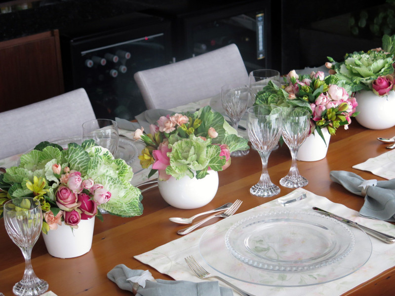 Por sorte, quando fui comprar as flores para os arranjos da mesa dela, encontrei os repolhos e pronto, mudei os planos de uma mesa colorida, para uma mesa clean onde os repolhos e as rosas foram destaque na mesa de aniversário que preparei para ela.