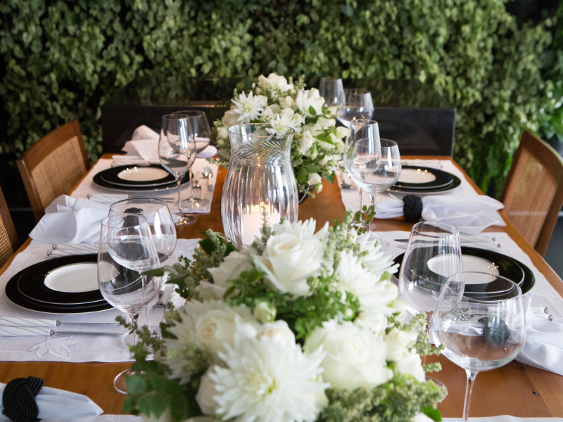 Os arranjos nos vasos de cristal preto lapidados (um deles preto com lapidação na cor branca) contaram com Dálias (uma das minhas prediletas e dela também), rosas brancas, rosa spray (as pequenas) e folhagens: