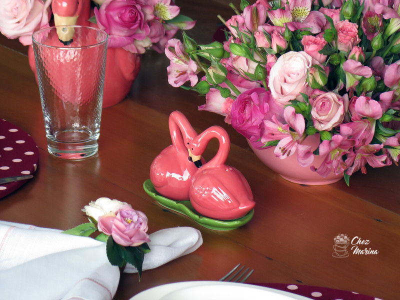 Então foi isso que aconteceu! Escolhi como a Renata, proprietária da loja os pratos e jogos Americanos também e providenciei rosas e astromélias em tons de rosa para os arranjos.