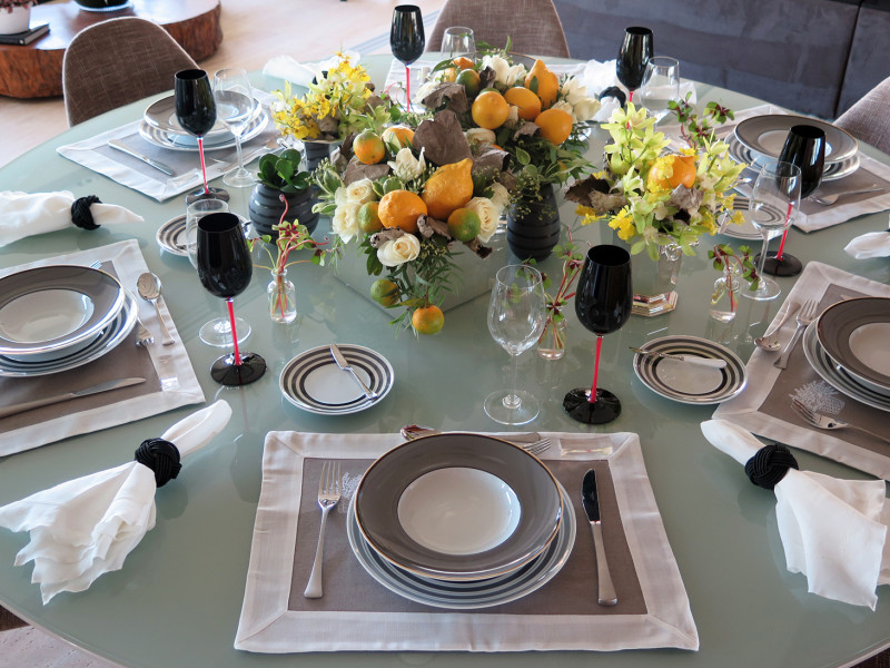 Vamos falar sobre o elemento dessa mesa que em minha opinião a torna única e cheia de bossa: As taças em cristal de vinho ou água preta com os pés vermelhos da marca Riedel Wine Glass Company.