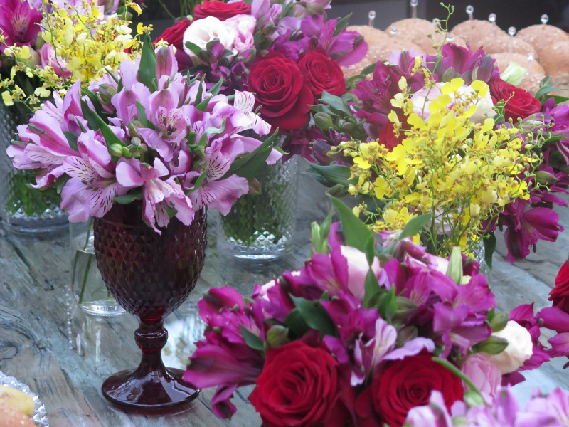Ao chegar na casa dos proprietários da casa (também padrinhos), não encontrei vasos de cristal, nem de cerâmica ou porcelana, por isso decidi usar taças e copos de vidro.