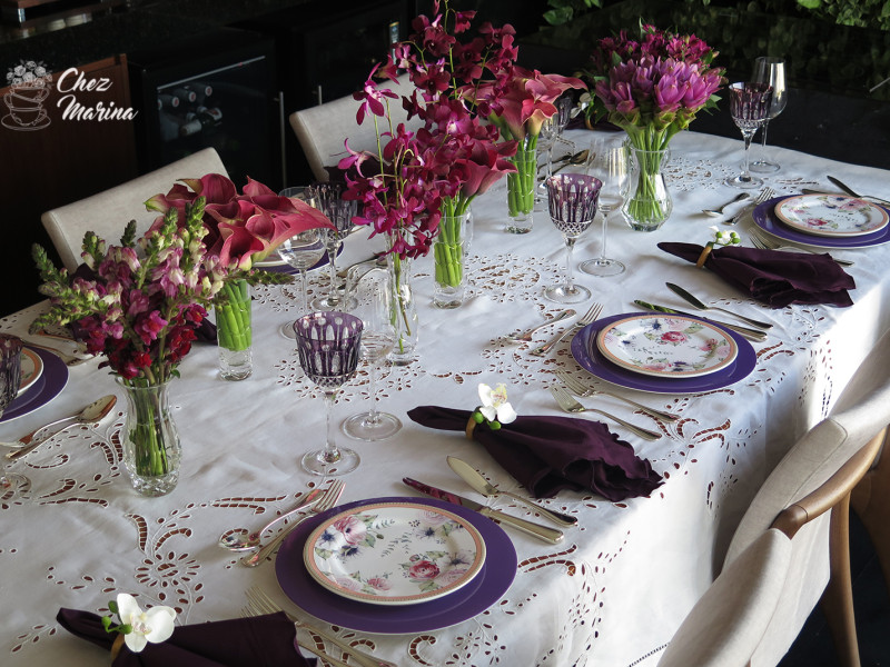 Para compor com o colorido das flores, escolhi guardanapos e taças também na cor violeta (ametista).