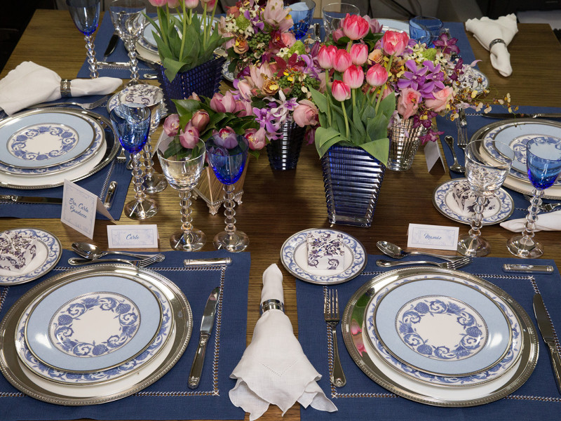 Vou começar mostrando a minha mesa clássica nos tons de azul, branco e rosa, com pratos de porcelana da marca Noritake, Taças de cristal Baccarat; Jogos-americanos de linho; Sousplat, talheres e descanso de talher de prata da marca Christoflè e vasos de cristal nas cores Azul e transparente Baccarat e cachepot de prata da marca Montpellier.