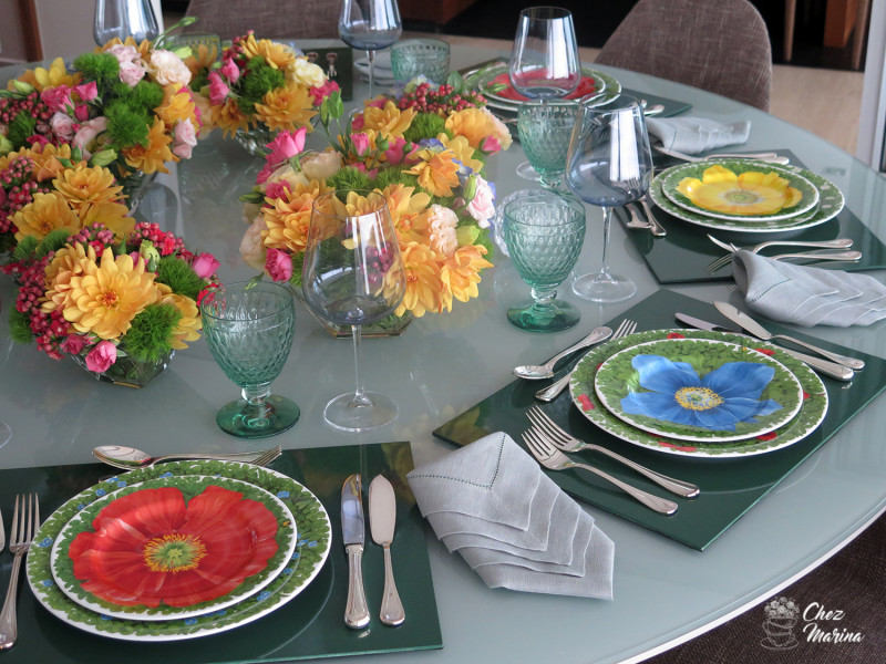 Pensando na alegria e vivacidade das cores da porcelana, eu escolhi flores alegres como as dálias, hortênsias, rosas, kalandivas, lisianthus e green ball, nos tons dos pratos: verde, amarelo, azul, vermelho e branco.