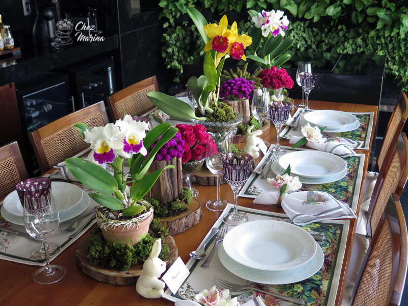 O ponto de partida foram os guardanapos e jogos americanos com motivos de Páscoa, o toque chic ficou por conta das taças de cristal lapidadas que eu adoro e já usei em algumas mesas.